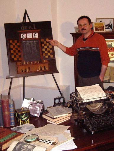 Betreuer Frank Kimpinsky in Aktion. Auf der Tafel ist eine Partie aus dem Wettkampf Lasker - Capablanca festgehalten.